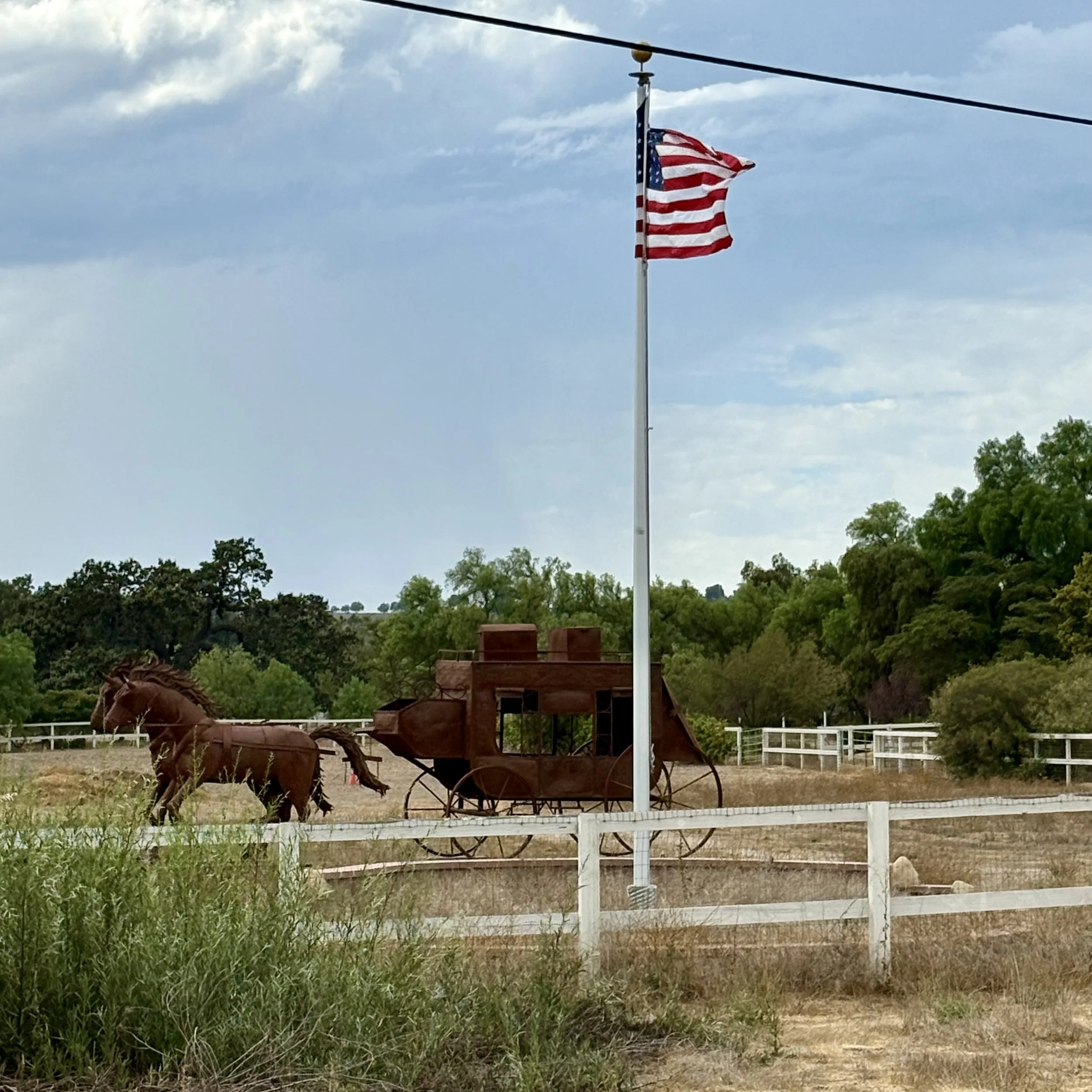 This piece of art was constructed to show the history of the vibrant west and the stagecoach transportation.